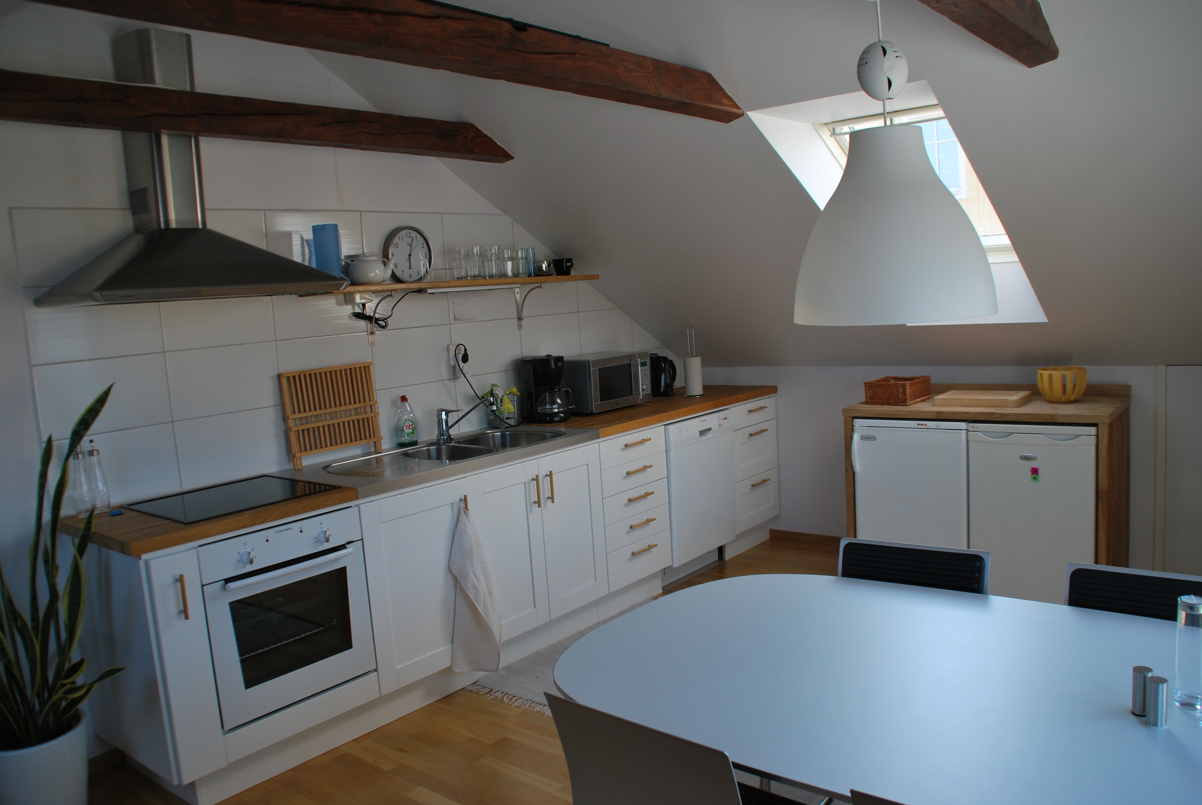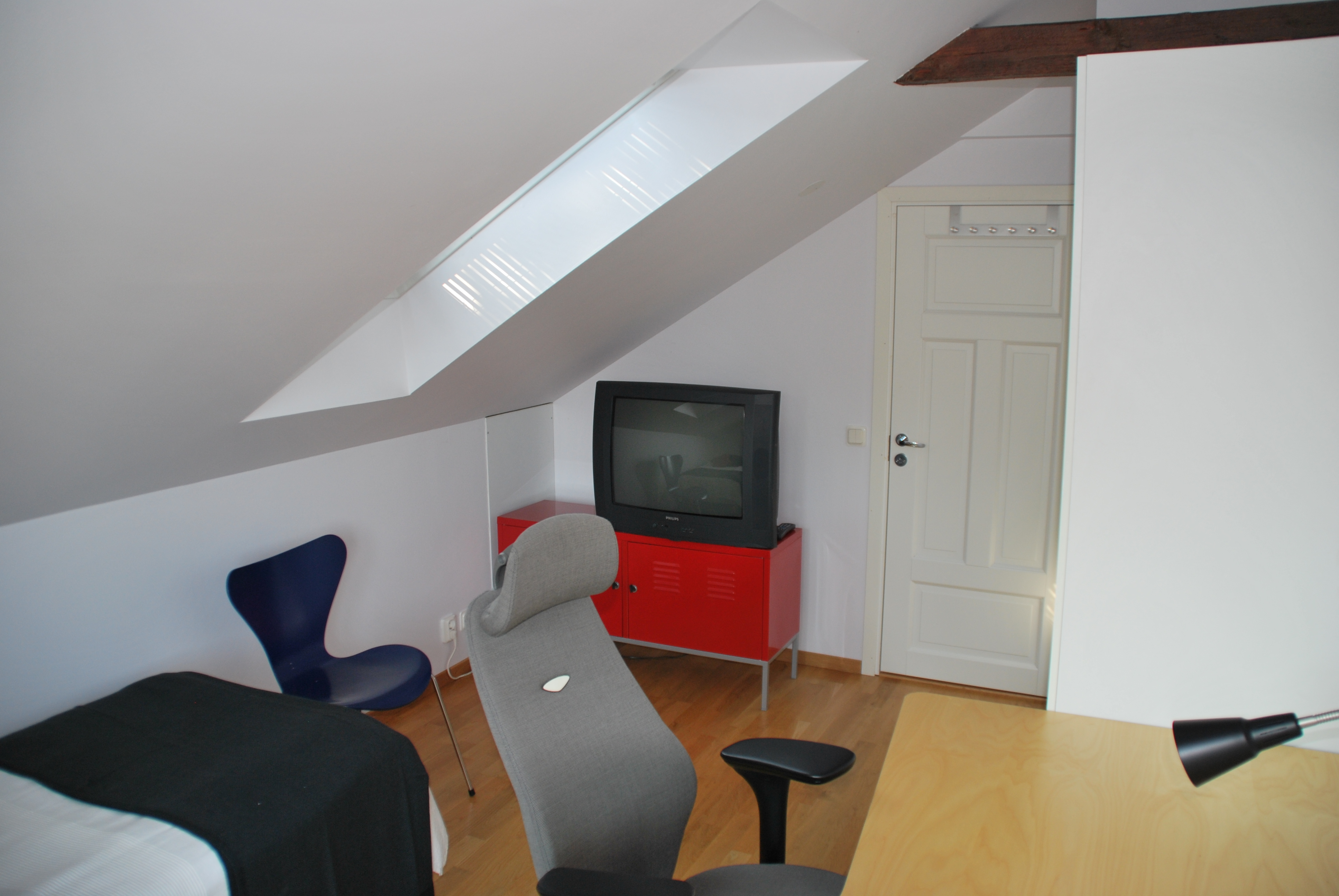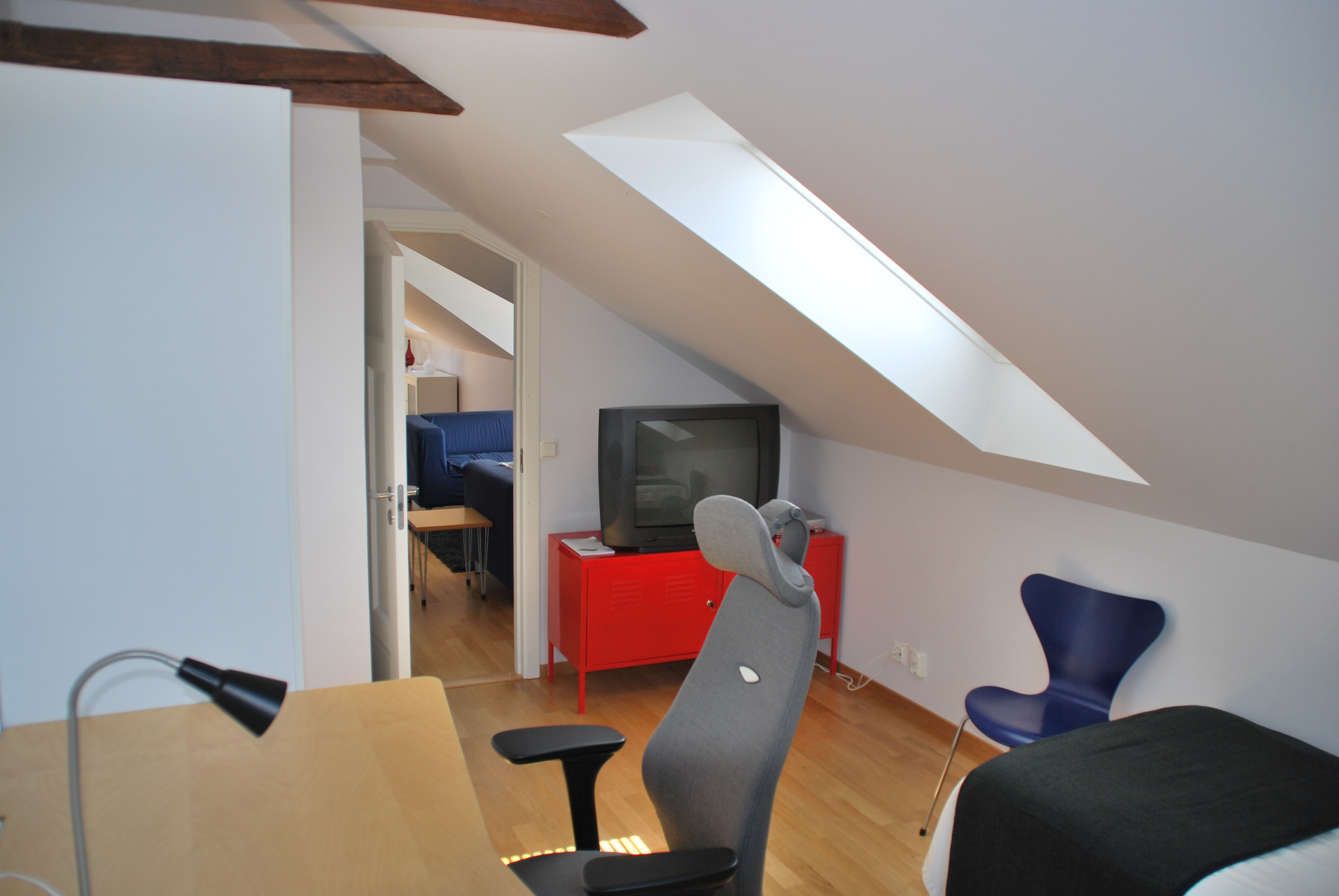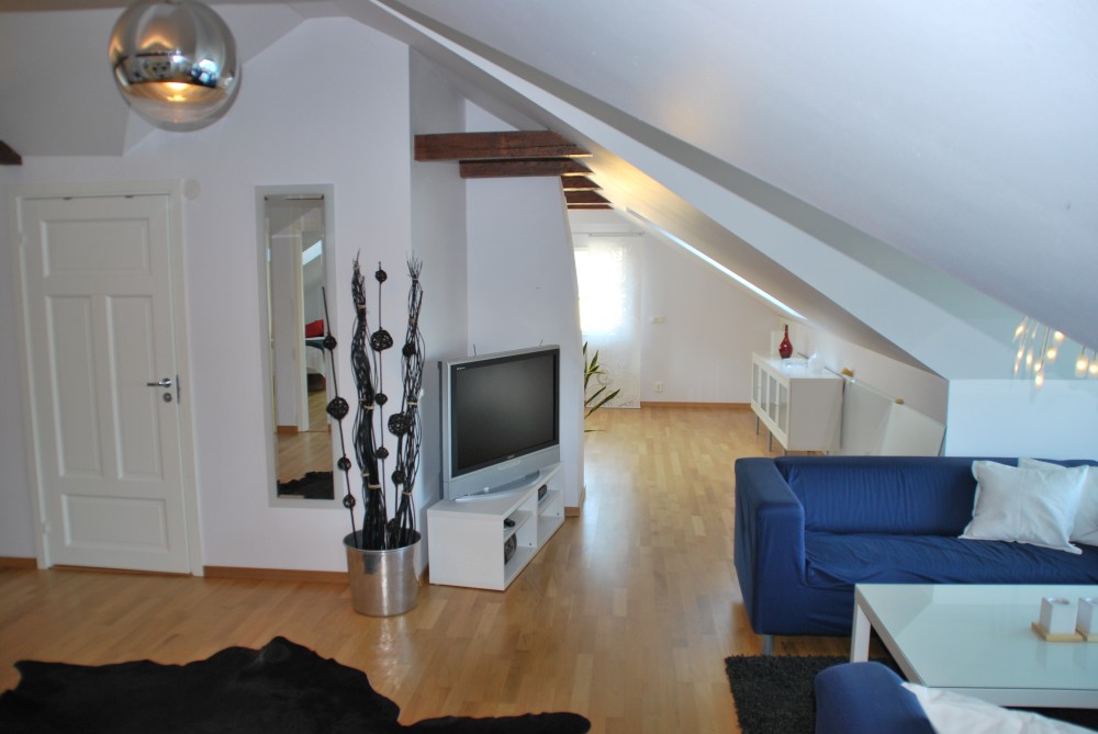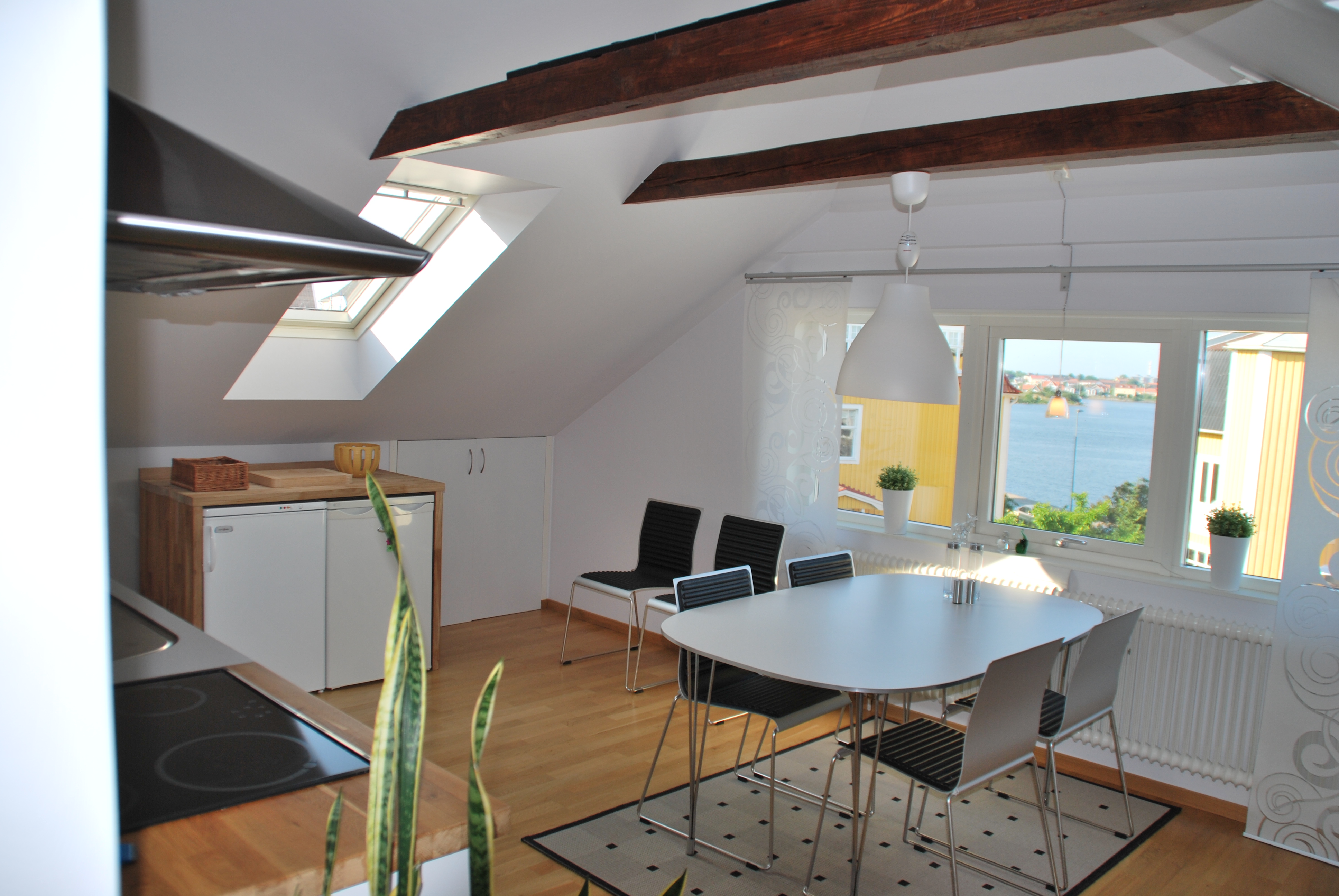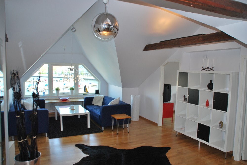 Takvåningen är på 90 m² och består av två sovrum, ett stort vardagsrum, kök, toalett med dusch samt en blkong. Här bjuds det på en fantastisk utsikt över Borgmästarefjärden och centrum. Lägenheten är fullt möblerad , köket är fullt utrustat och har både kyl, frys, spis, ugn, microvågsugn och diskmaskin. I vardagsrummet finns en större Tv. I ett av sovrummet är möblerat med enkelsäng samt ett skrivbord och i det andra sovrummet är det en dubbelsäng. Det finns även möjlighet att nyttja en modern tvättstuga . Bredband och parkeringsplats ingår.